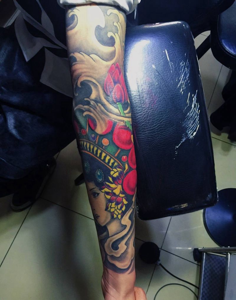 当前位置: 首页 >北京市纹身店-北京花刺纹身工作室纹身图案>今日作品花臂补色!纹身图片_成品手臂传统人物植物纹身图案