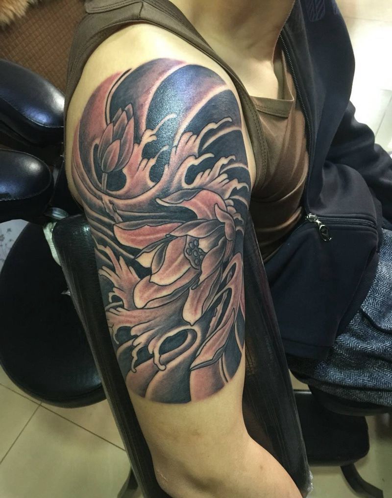 今日作品大臂莲花完成!纹身图片_成品手臂传统植物纹身图案