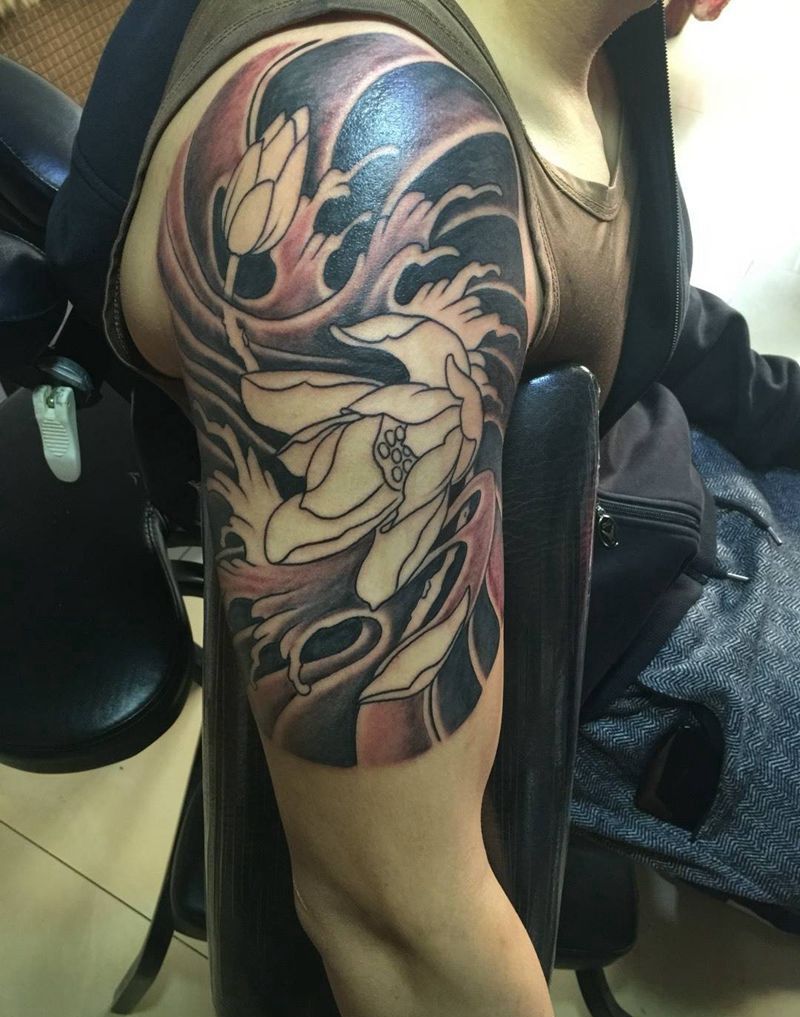 今日作品大臂莲花完成!纹身图片_成品手臂传统植物纹身图案