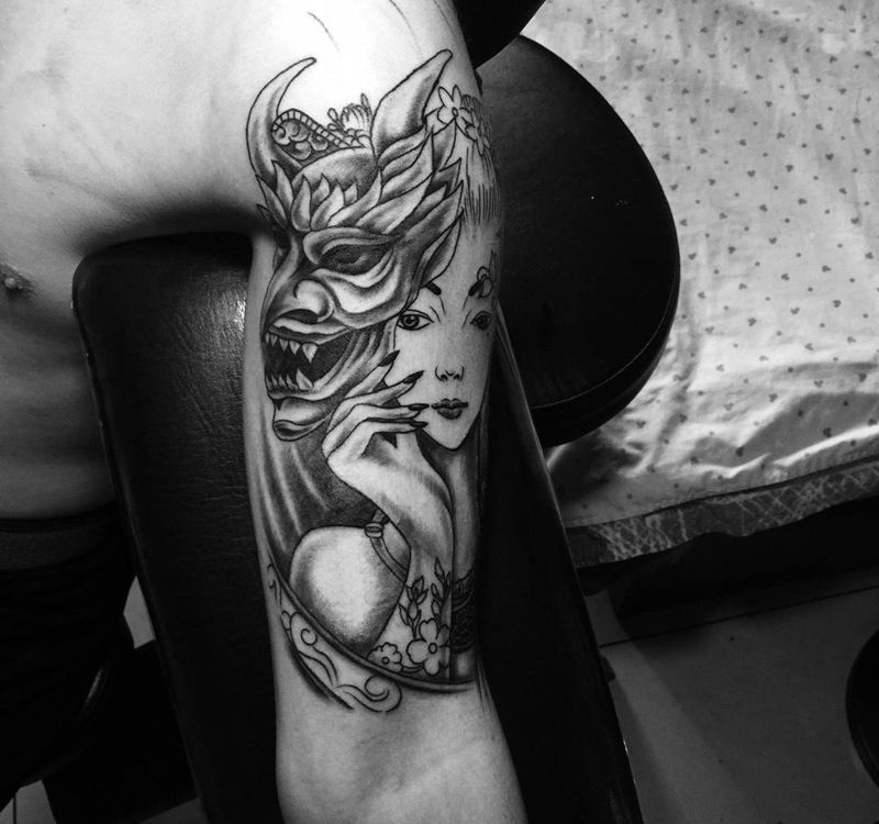 今日工作大臂艺妓未完成纹身图片_手臂传统人物写实纹身图案