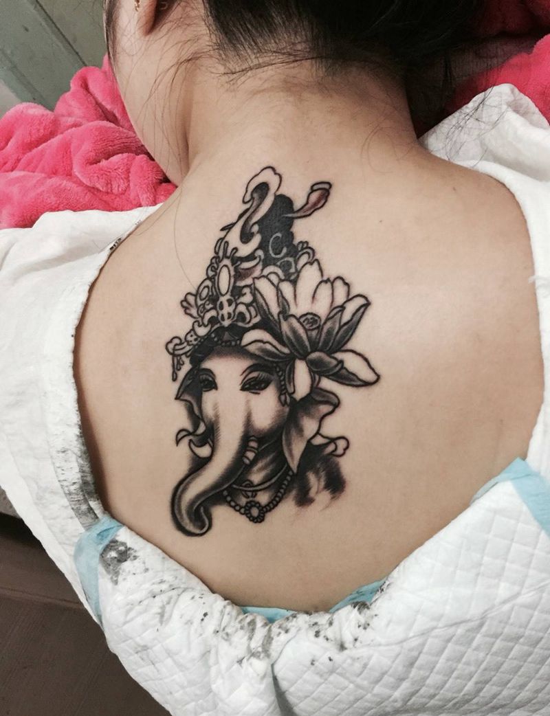 小象神一枚纹身图片_成品背部传统人物动物宗教纹身图案