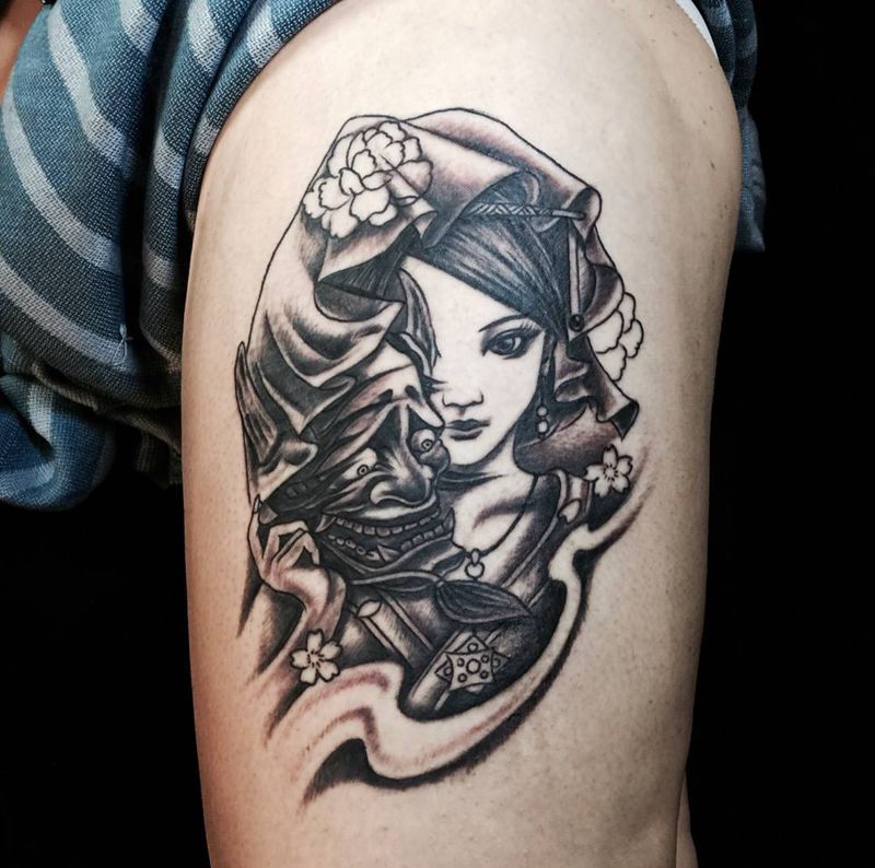 今日作品大美妞一枚!纹身图片_成品腿部传统人物鬼神植物纹身图案