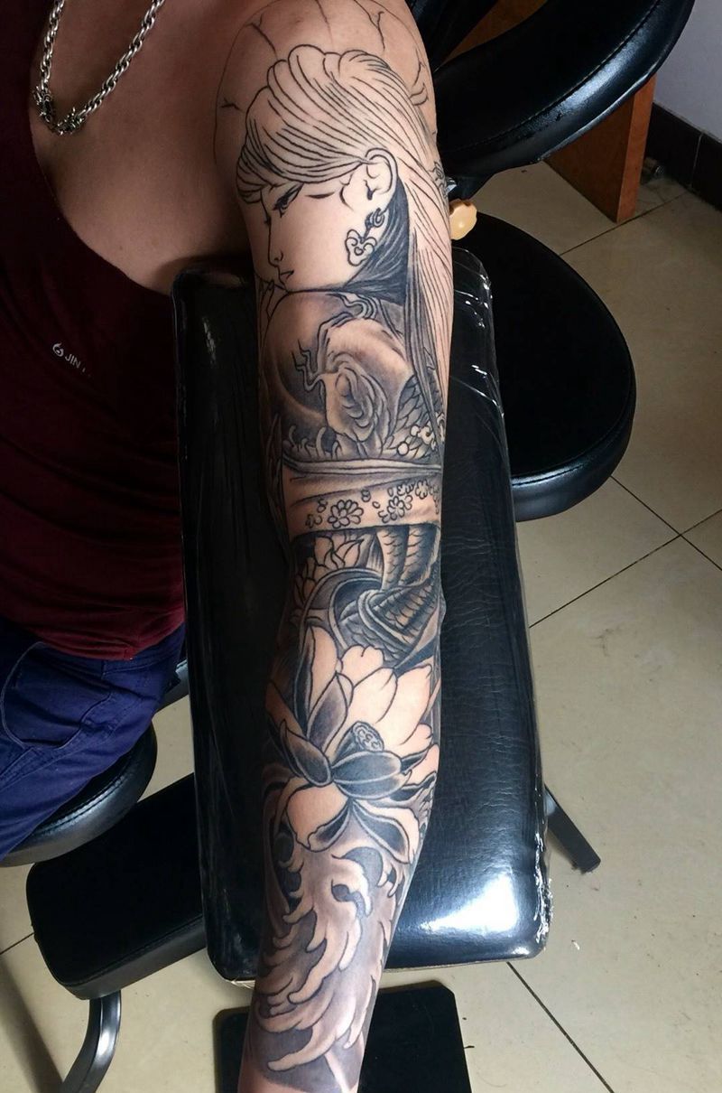 今日作品花臂完成!纹身图片_成品手臂传统人物植物纹身图案