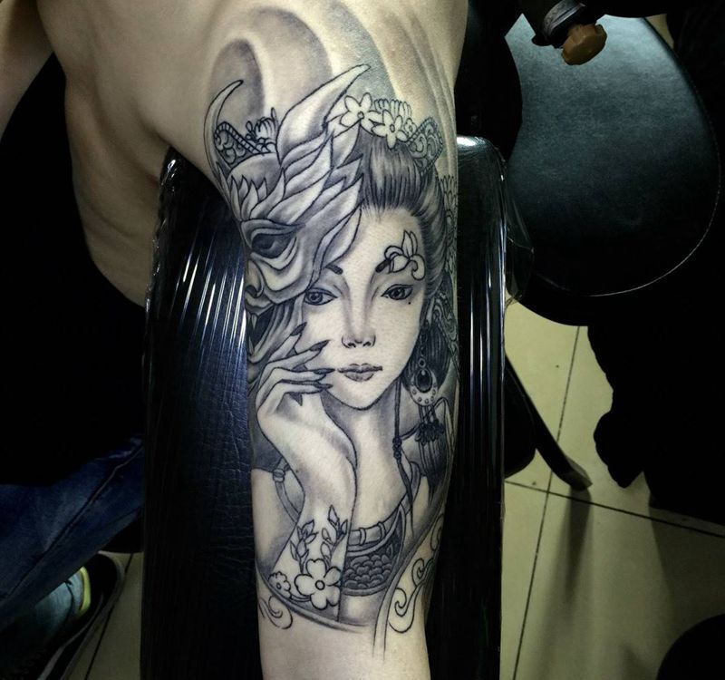 当前位置: 首页 >北京市纹身店-北京花刺纹身工作室纹身图案>今日工作大臂艺妓完成!纹身图片_