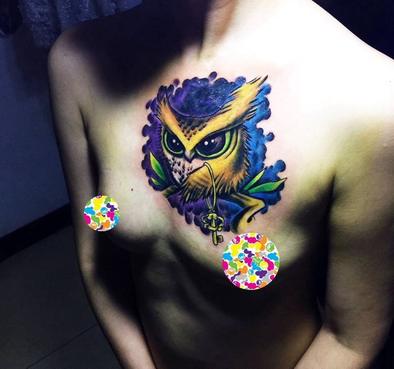 当前位置: 首页 >北京市纹身店-北京花刺纹身工作室纹身图案>今日工作胸前遮盖猫头鹰完成纹身图片_