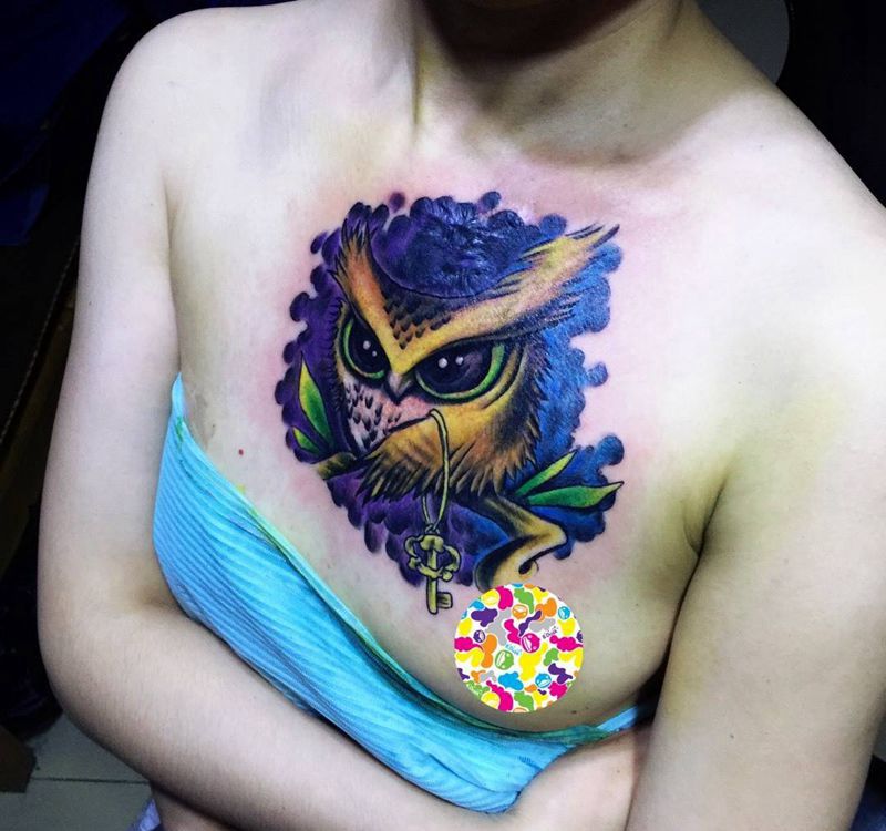 当前位置: 首页 >北京市纹身店-北京花刺纹身工作室纹身图案>今日工作胸前遮盖猫头鹰完成纹身图片_