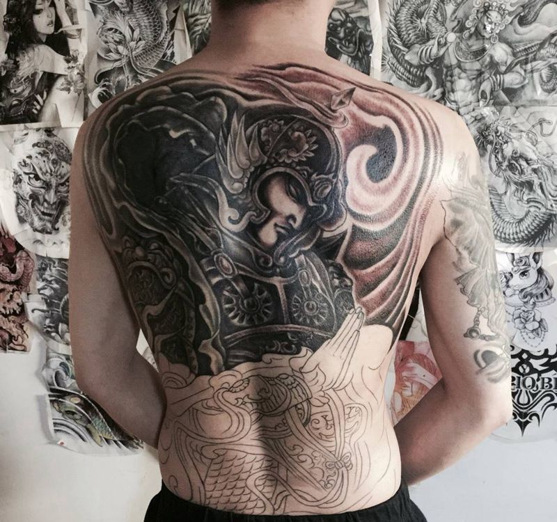 当前位置: 首页 >北京市纹身店-北京花刺纹身工作室纹身图案>今日工作满背韦坨遮盖未完成纹身图片_