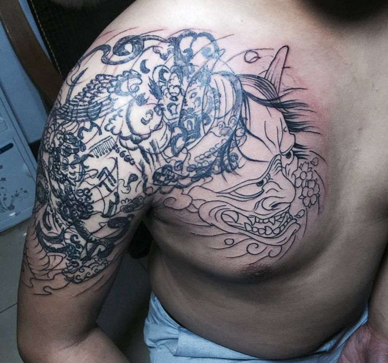 今日工作半甲遮盖未完成纹身图片_胸部手臂传统人物动物纹身图案