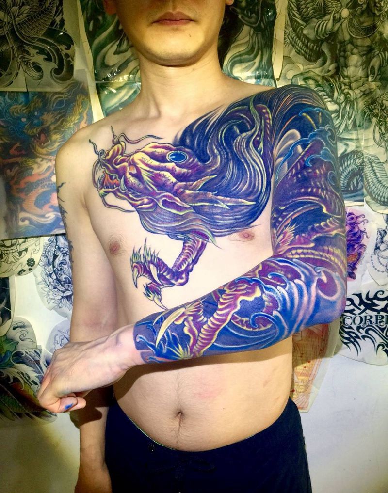 今日工作过肩龙遮盖纹身图片_胸部手臂传统动物纹身图案