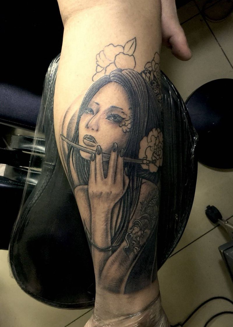 艺妓VS印第安女孩纹身图片_欧美传统腿部人物纹身图案