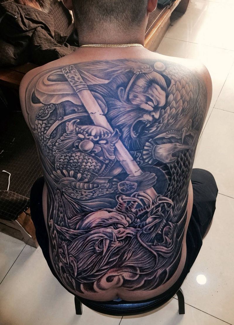 今日工作满背斗战胜佛纹身图片_传统背部人物动物纹身图案
