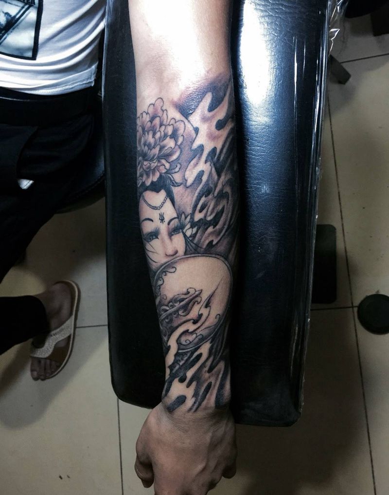 当前位置: 首页 >北京市纹身店-北京花刺纹身工作室纹身图案>今日工作包小臂艺妓纹身图片_成品传统人物纹身图案