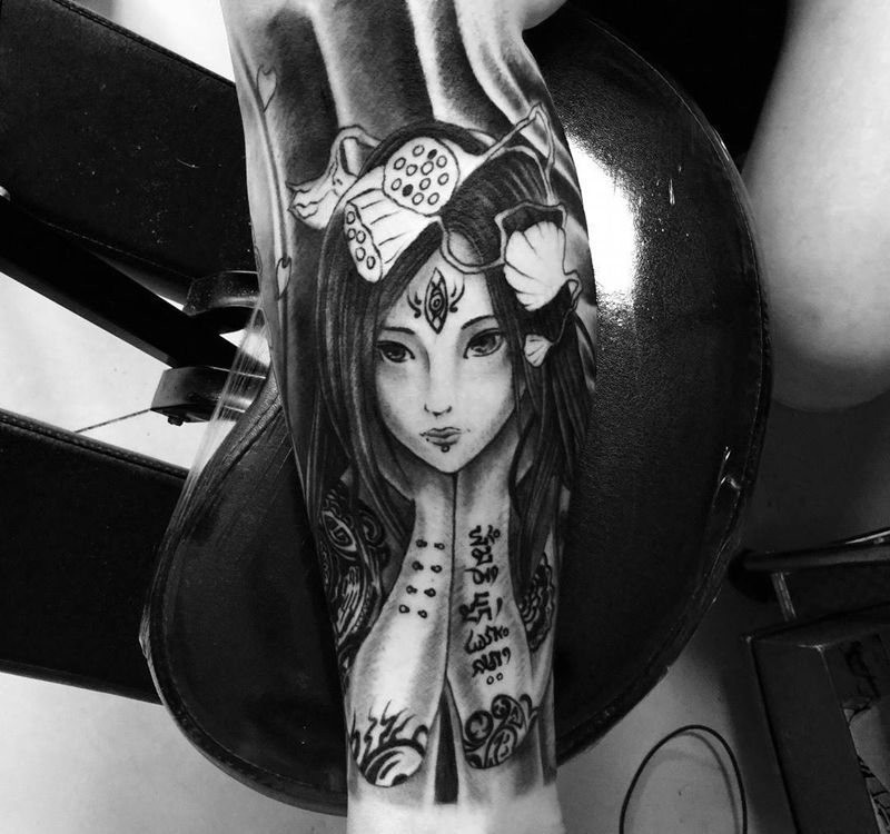 今日工作包小腿纹身图片_人物鬼神传统腿部纹身图案