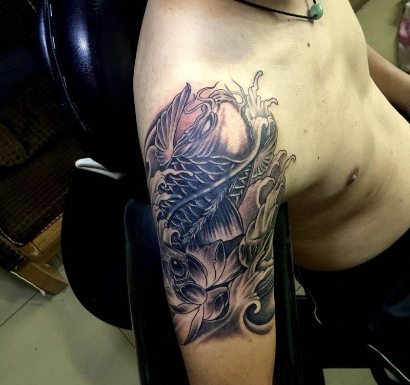 今日工作大臂鲤鱼遮盖纹身图片_成品手臂传统动物静物纹身图案