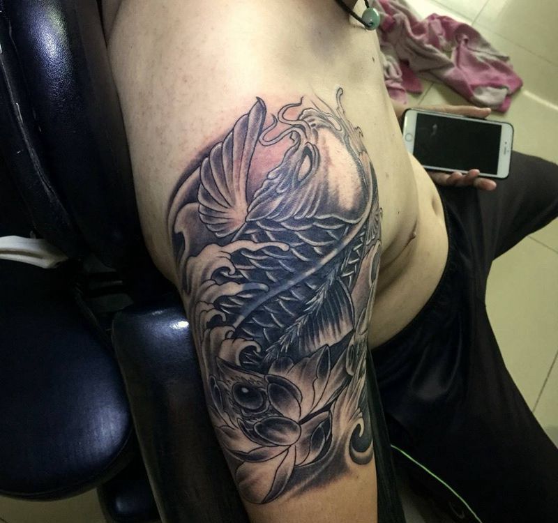 今日工作大臂鲤鱼遮盖纹身图片_成品手臂传统动物静物纹身图案