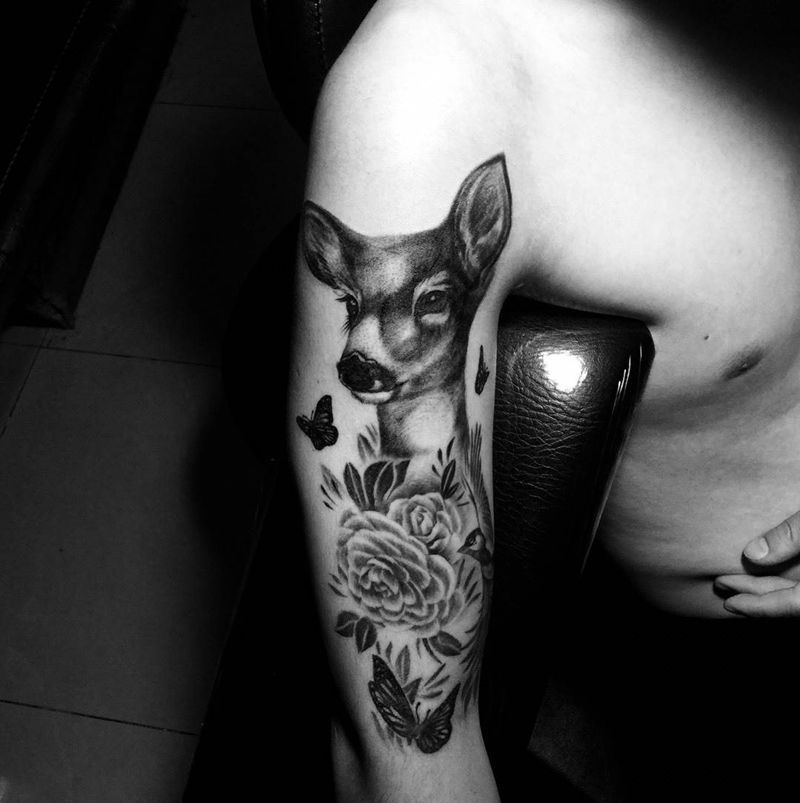 今日工作大臂鹿头纹身图片_欧美写实手臂成品动物静物纹身图案