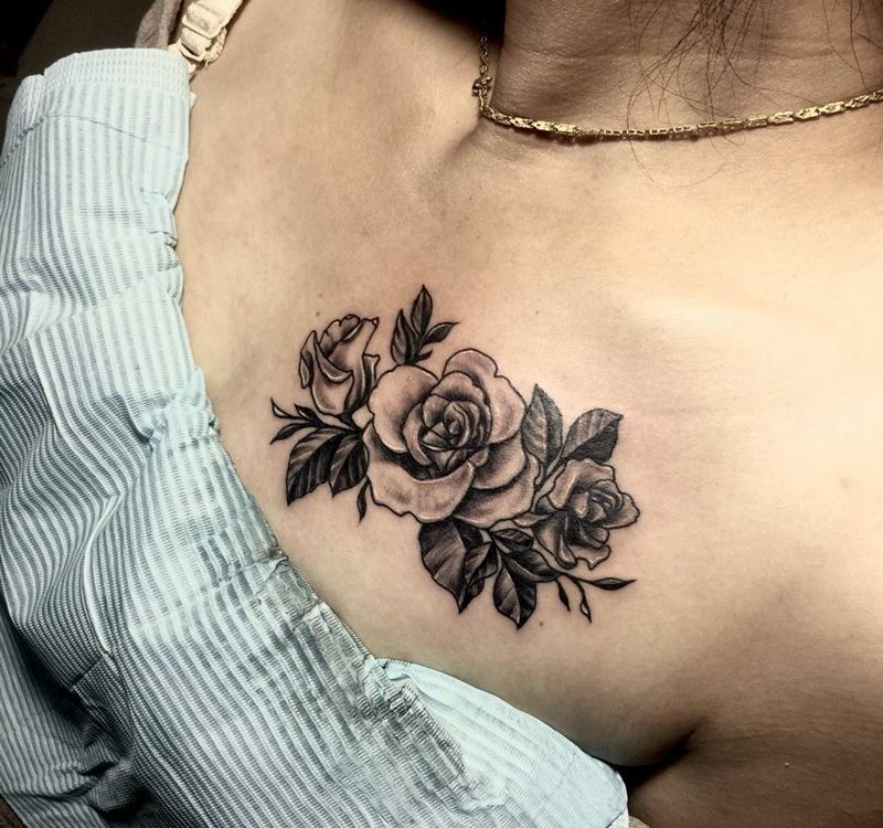 今日工作胸前玫瑰纹身图片_欧美写实植物胸部纹身图案