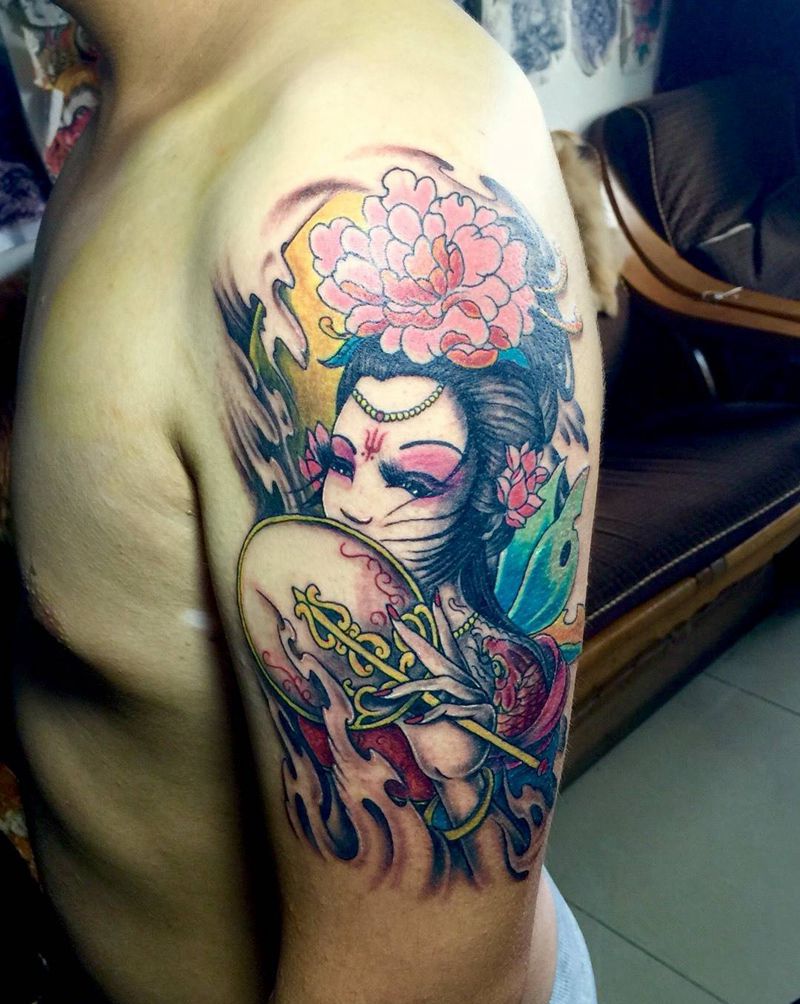 今日工作大臂艺妓纹身图片_手臂传统人物植物动物纹身图案