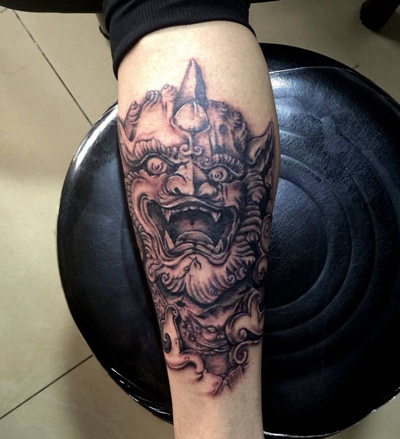 今日工作小腿唐狮纹身图片_成品腿部传统写实动物纹身图案