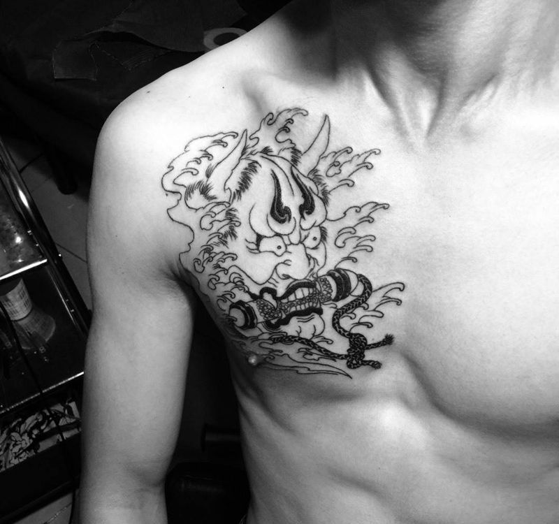 近日学员小宁遮盖作品及胸前般若割纹身图片_胸部传统人物鬼神植物纹身图案