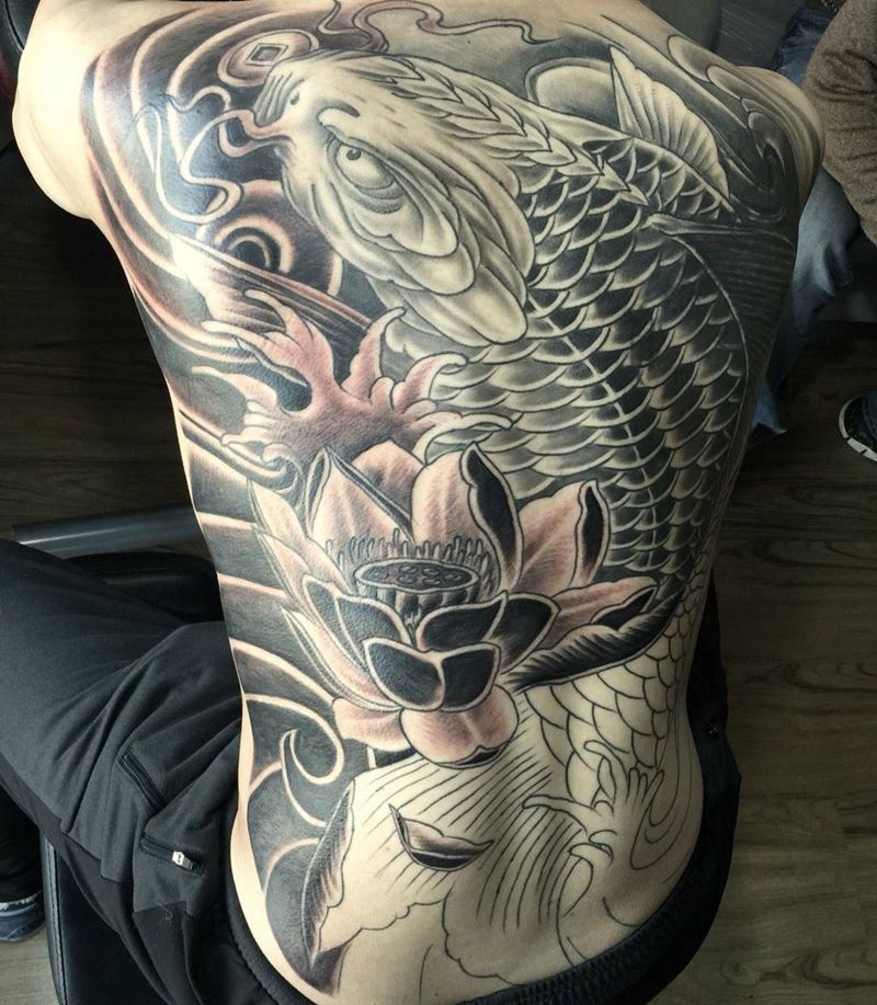 当前位置: 首页 >北京市纹身店-北京花刺纹身工作室纹身图案>今日工作满背鲤鱼遮盖未完成纹身图片_