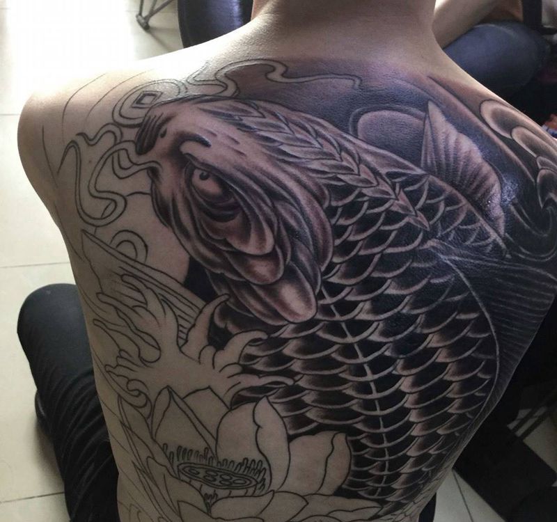 当前位置: 首页 >北京市纹身店-北京花刺纹身工作室纹身图案>今日工作满背鲤鱼遮盖未完成纹身图片_