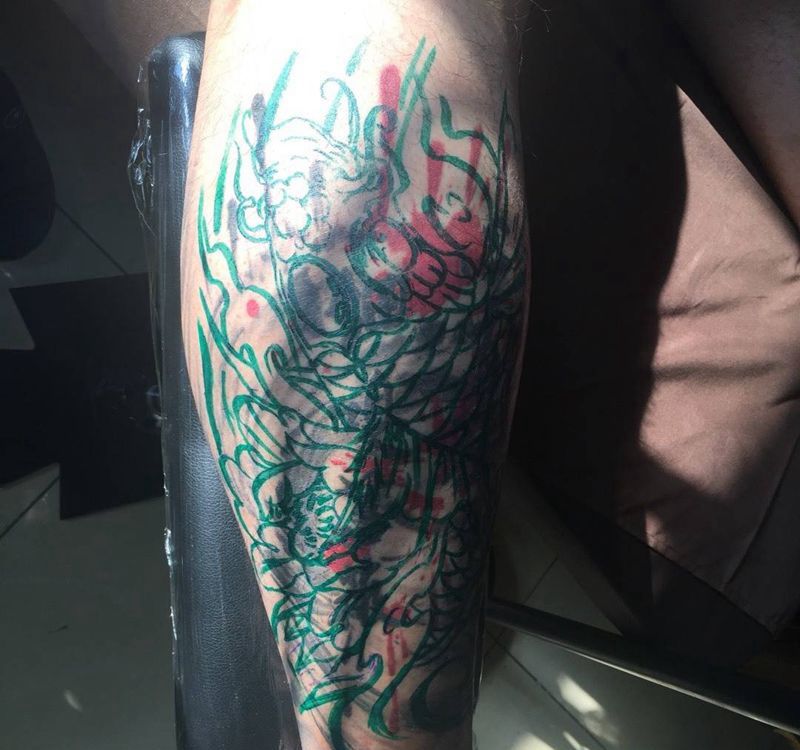 • T网红王老大花腿龙纹身图片_腿部新传统纹身图案