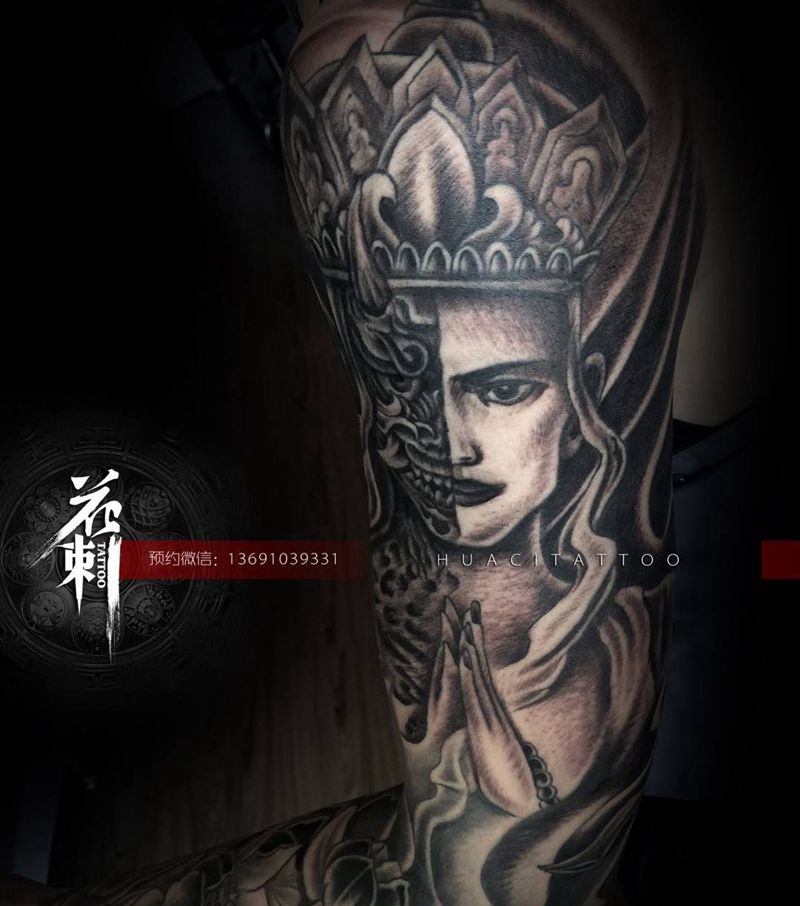 当前位置: 首页 >北京市纹身店-北京花刺纹身工作室纹身图案>【一念入魔一念成佛】纹身图片_成品手臂传统人物鬼神宗教静物纹身图案