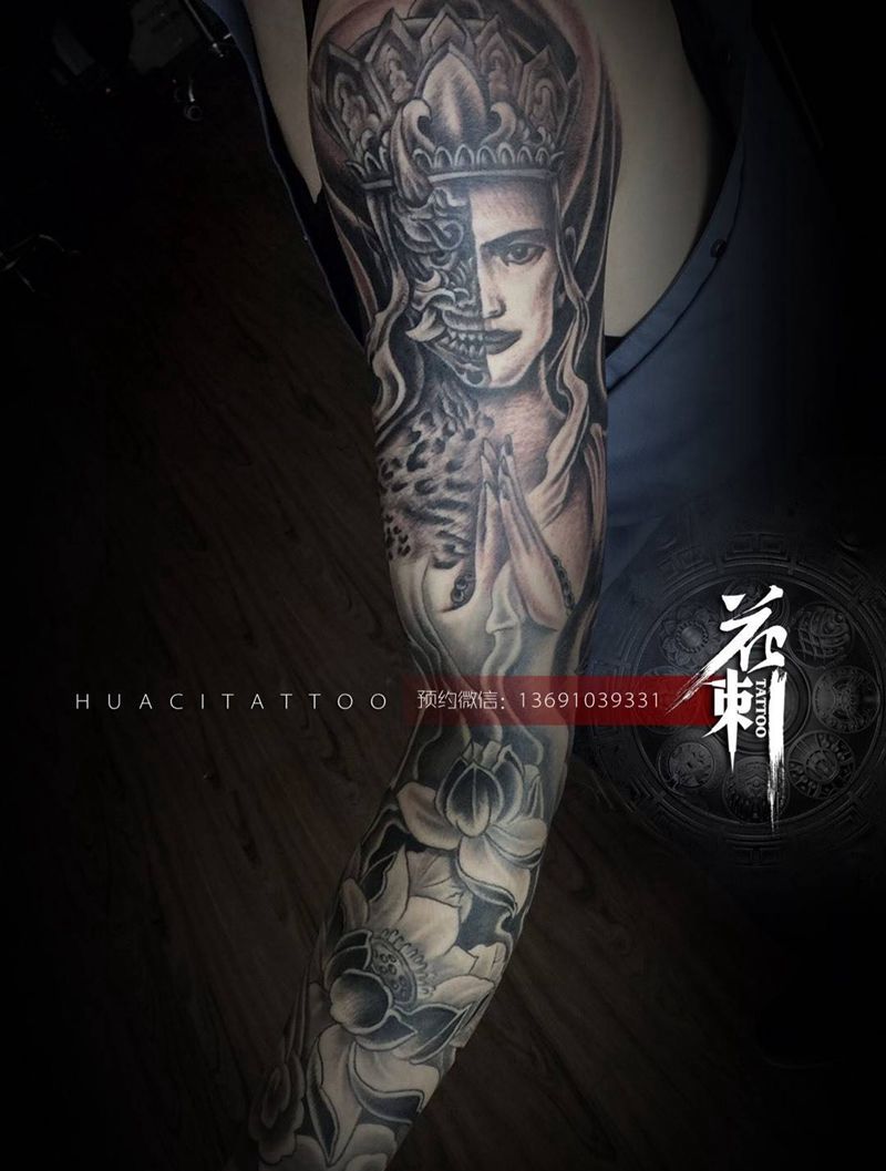 当前位置: 首页 >北京市纹身店-北京花刺纹身工作室纹身图案>【一念入魔一念成佛】纹身图片_成品手臂传统人物鬼神宗教静物纹身图案