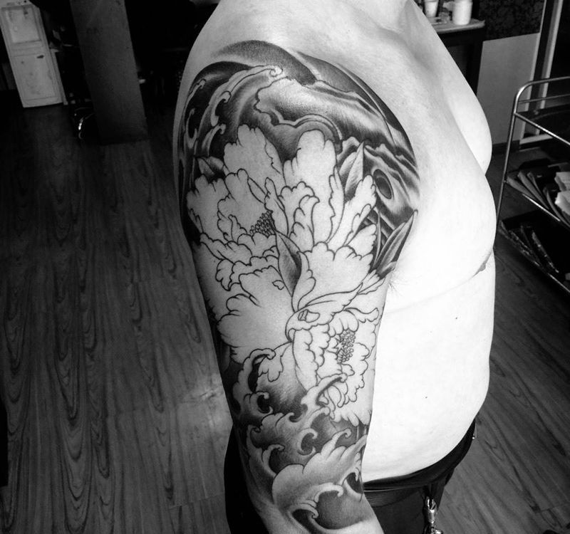 今日工作大臂牡丹未完成下次继续纹身图片_手臂传统植物纹身图案