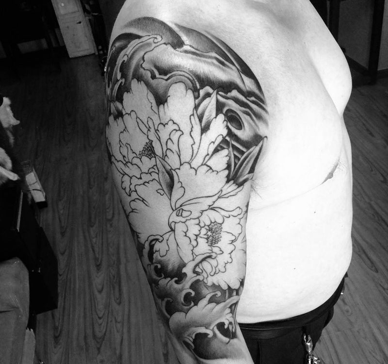 今日工作大臂牡丹未完成下次继续纹身图片_手臂传统植物纹身图案
