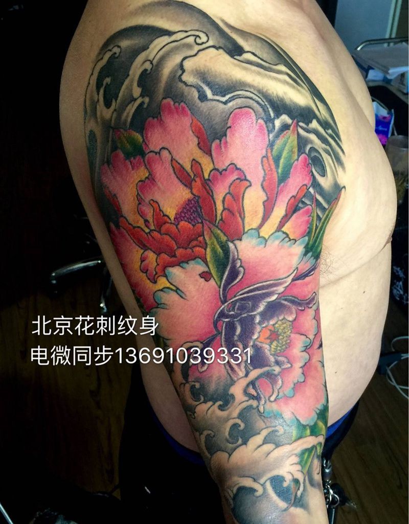 今日工作半臂牡丹完成!纹身图片_成品手臂传统植物纹身图案
