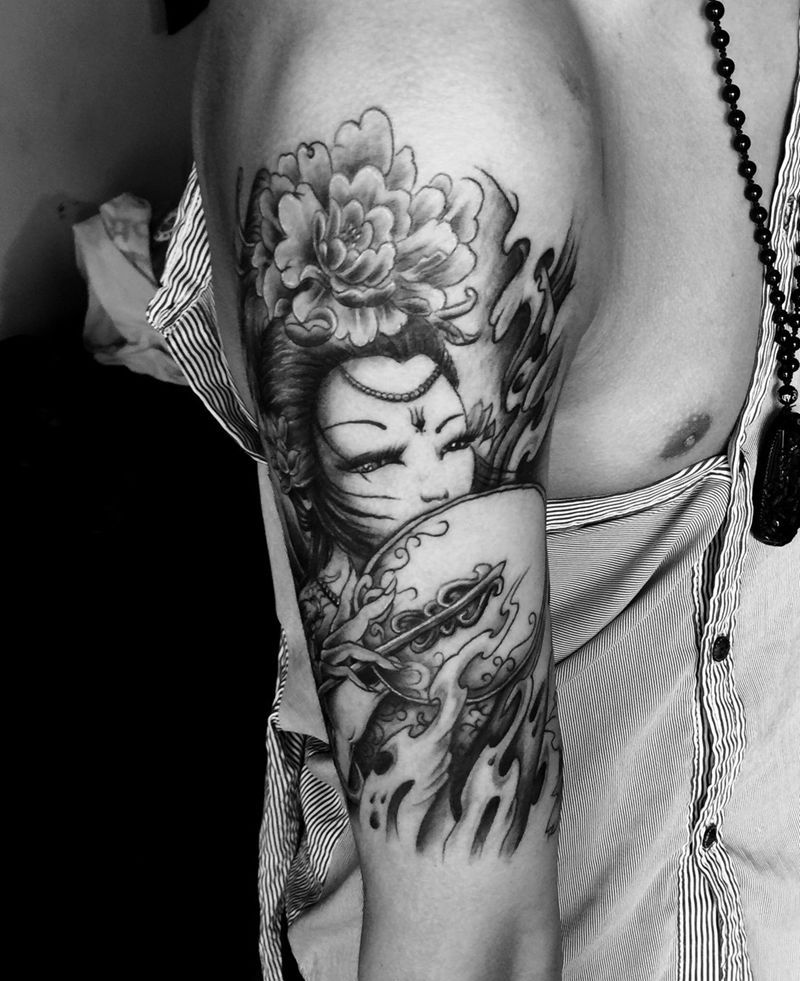 今日小宁工作艺妓包大臂纹身图片_成品手臂传统人物静物纹身图案