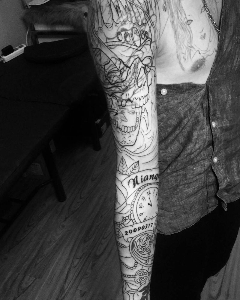当前位置: 首页 >北京市纹身店-北京花刺纹身工作室纹身图案>今日工作大臂遮盖花臂割线未完成纹身图片_传统手臂植物静物纹身图案