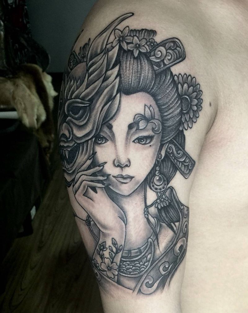 今日工作大臂艺妓完成纹身图片_成品手臂传统人物纹身图案