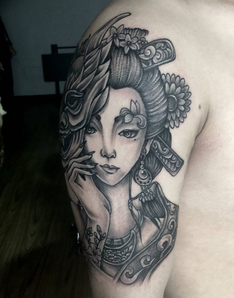 今日工作大臂艺妓完成纹身图片_成品手臂传统人物纹身图案