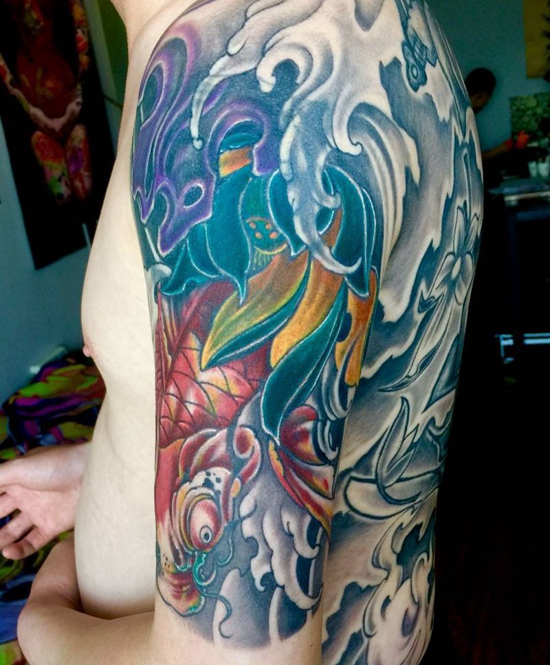 今日工作大臂遮盖鲤鱼完成纹身图片_手臂成品传统动物植物纹身图案