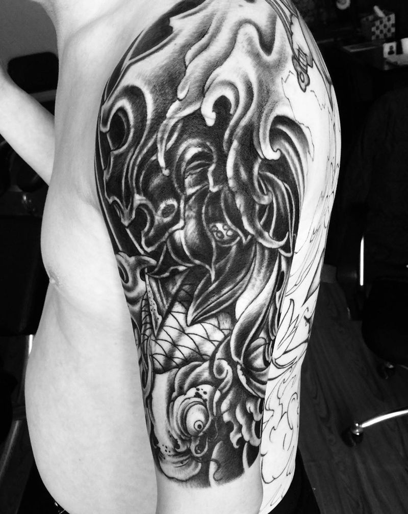 今日工作大臂遮盖鲤鱼完成纹身图片_手臂成品传统动物植物纹身图案
