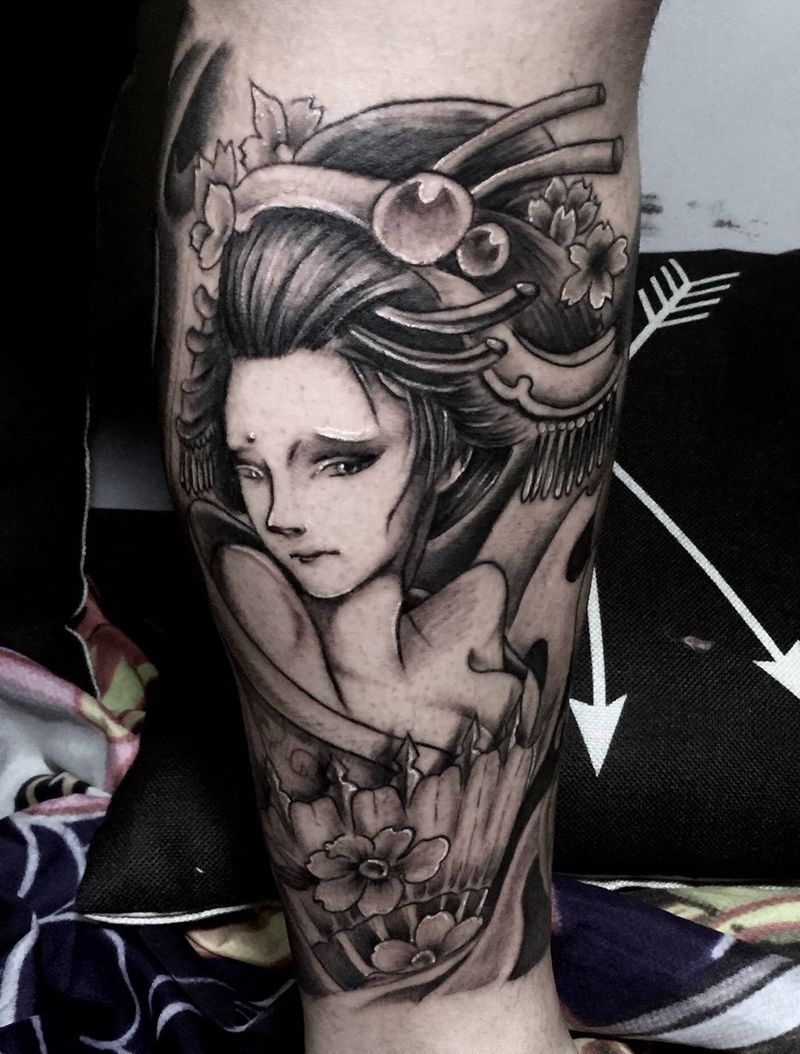 当前位置: 首页 >北京市纹身店-北京花刺纹身工作室纹身图案>如来大圣艺妓包小腿纹身图片_成品腿部传统人物宗教纹身图案