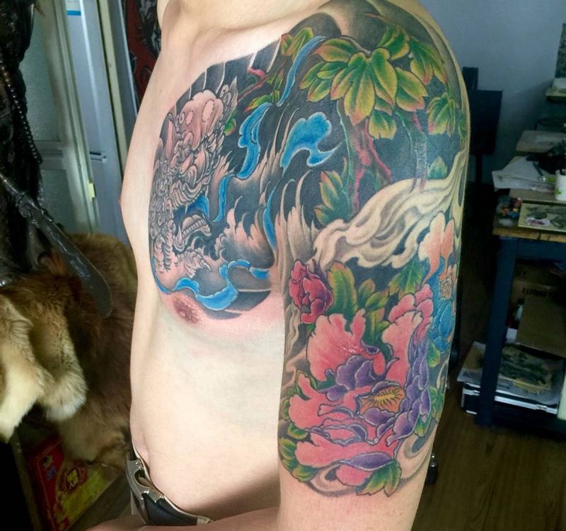 半甲唐狮牡丹纹身图片_传统胸部手臂动物植物纹身图案