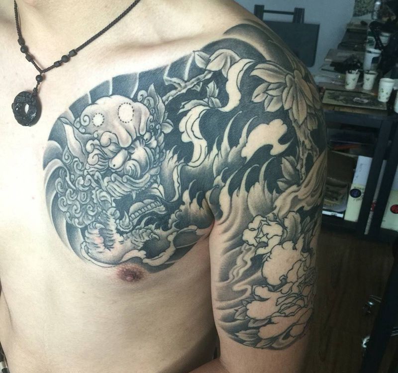 半甲唐狮牡丹纹身图片_传统胸部手臂动物植物纹身图案
