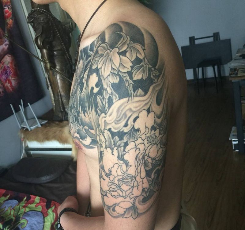 半甲唐狮牡丹纹身图片_传统胸部手臂动物植物纹身图案