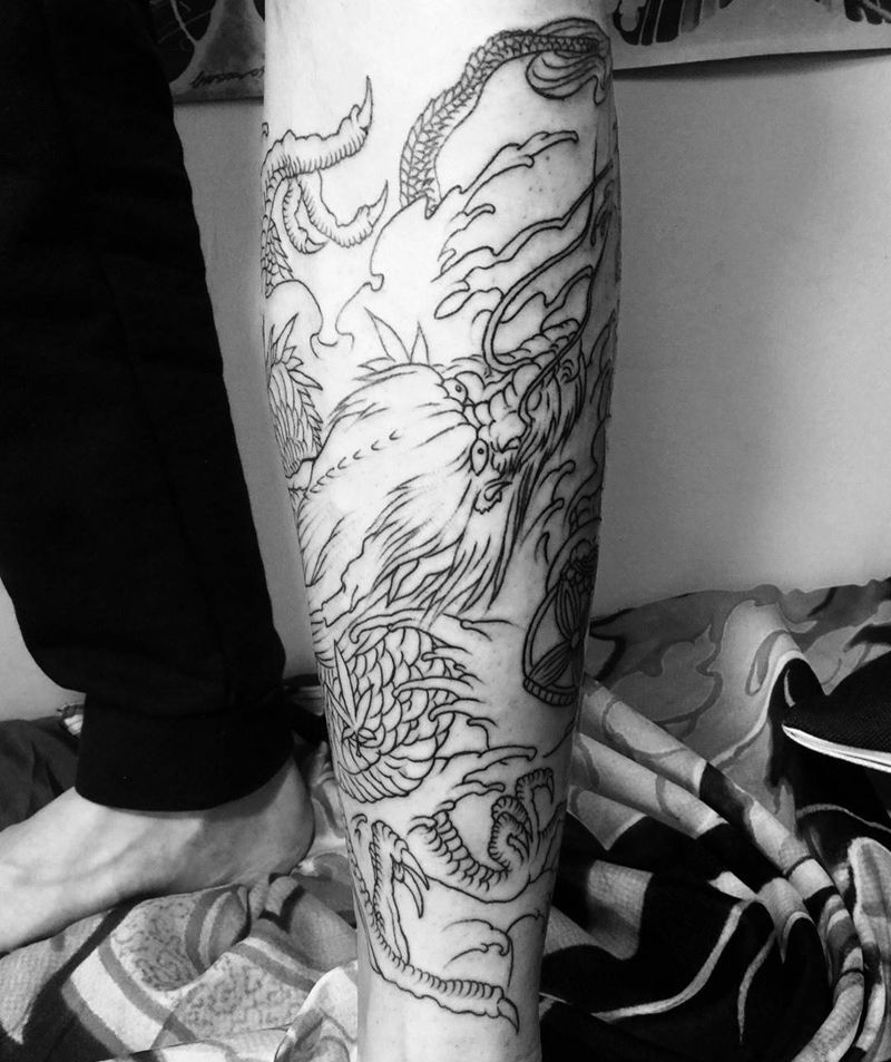 • T网红王老大花腿龙纹身图片_腿部新传统纹身图案
