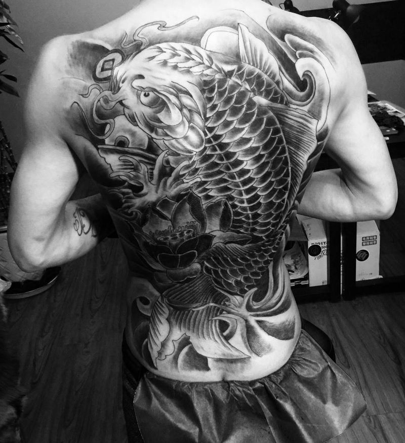 当前位置: 首页 >北京市纹身店-北京花刺纹身工作室纹身图案>学员小圆满背鲤鱼作品纹身图片_
