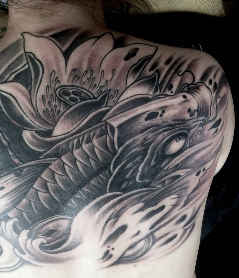 当前位置: 首页 >北京市纹身店-北京花刺纹身工作室纹身图案>半背遮盖鲤鱼纹身图片_成品背部传统动物静物纹身图案