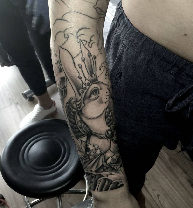 当前位置: 首页 >北京市纹身店-北京花刺纹身工作室纹身图案>接花臂小兔子纹身图片_手臂传统欧美动物植物纹身图案