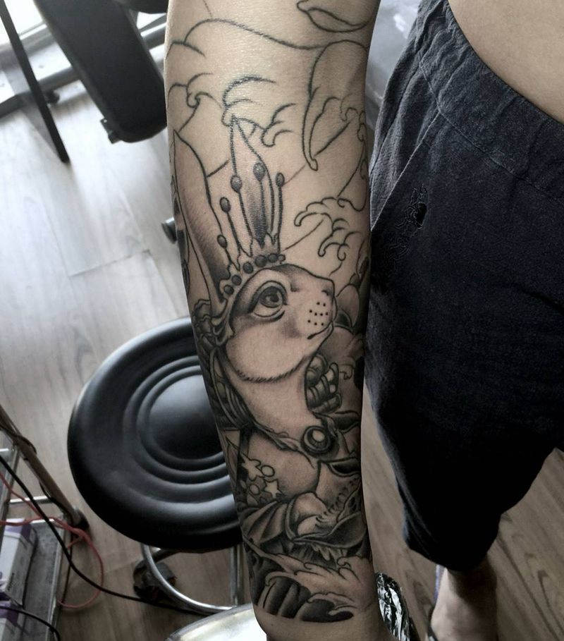 当前位置: 首页 >北京市纹身店-北京花刺纹身工作室纹身图案>接花臂小兔子纹身图片_手臂传统欧美动物植物纹身图案