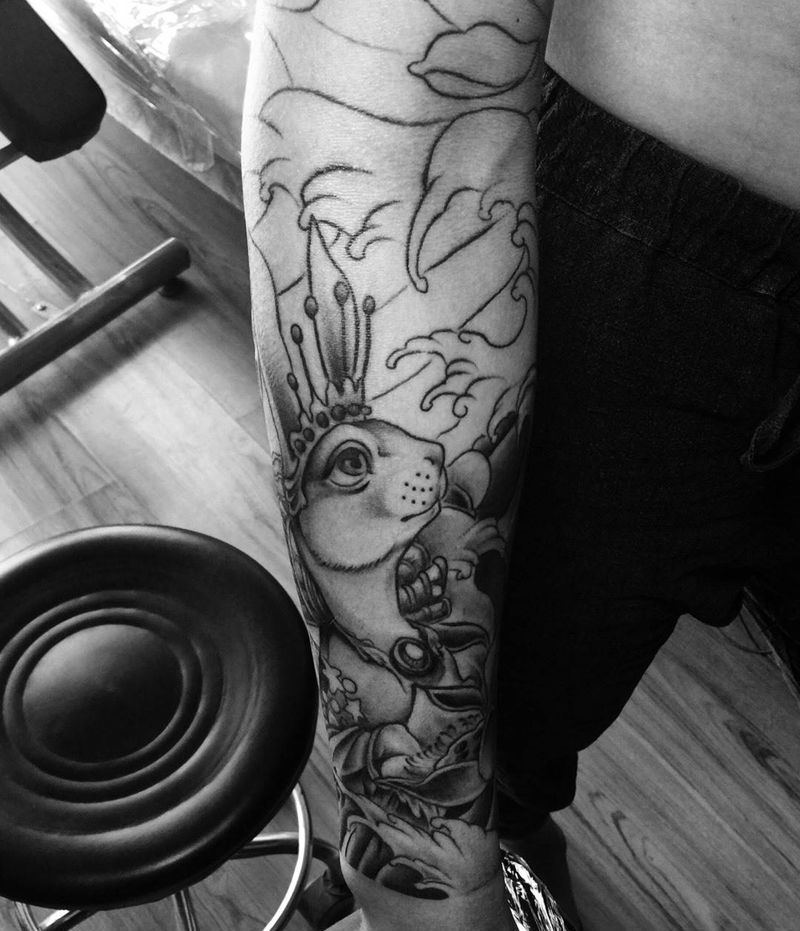 当前位置: 首页 >北京市纹身店-北京花刺纹身工作室纹身图案>接花臂小兔子纹身图片_手臂传统欧美动物植物纹身图案