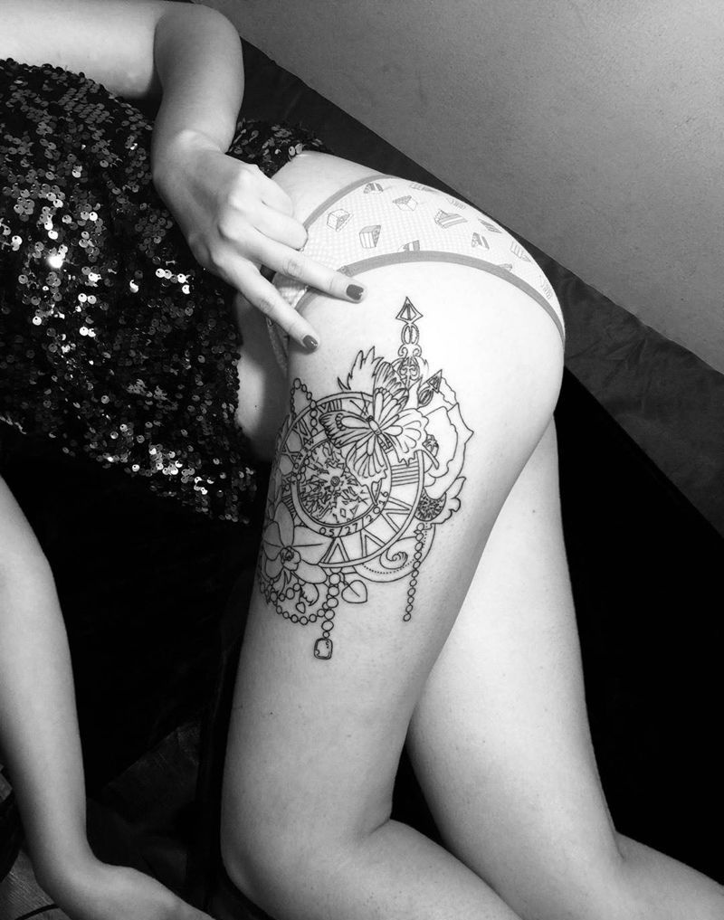 割线纹身图片_腿部欧美清新植物静物纹身图案