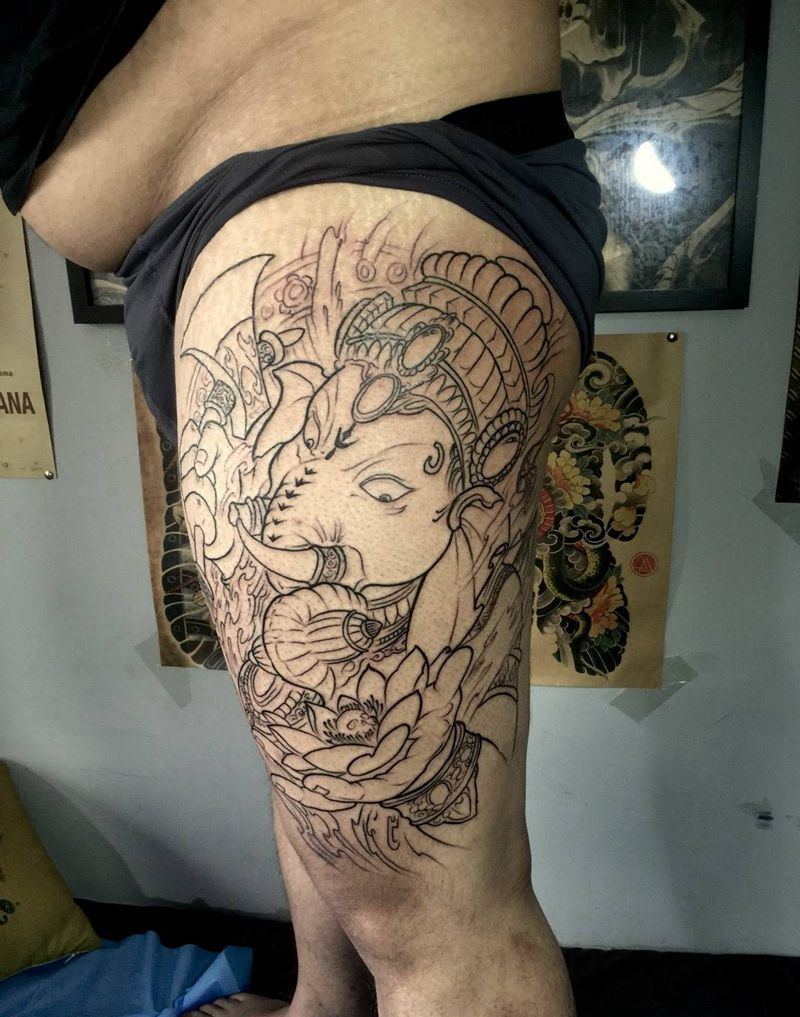 当前位置: 首页 >北京市纹身店-北京花刺纹身工作室纹身图案>象神纹身图片_腿部传统动物人物宗教纹身图案